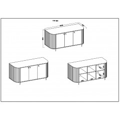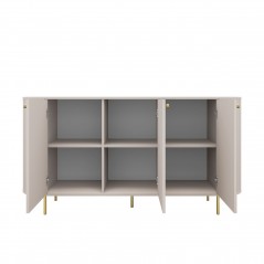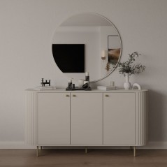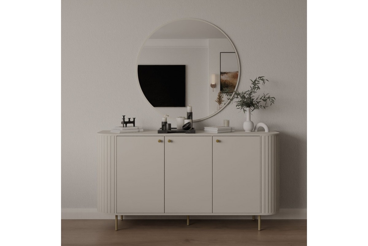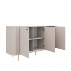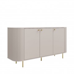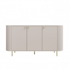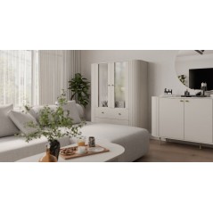 Delikatne frezy oraz minimalistyczna forma mebli tworzą elegancką całość, w której każdy detal ma znaczenie. Akcenty złota – w postaci metalowych uchwytów i nóg – dodają nowoczesnego charakteru, jednocześnie zachowując przytulny klimat.