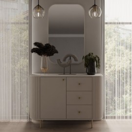 - Komoda posiada 3 fronty (2 fronty po bokach, 1 front pośrodku) oraz 1 szufladę