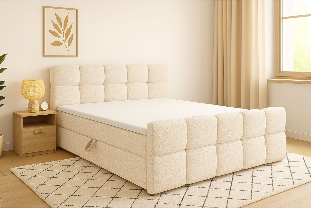 Podstawa łóżka wykonana jest z solidnej ramy tapicerowanej miękką tkaniną, na której umieszczony jest sprężynowy box, materac główny oraz opcjonalny topper. Dzięki temu łóżko idealnie dopasowuje się do sylwetki, zapewniając zdrowy i spokojny wypoczynek.