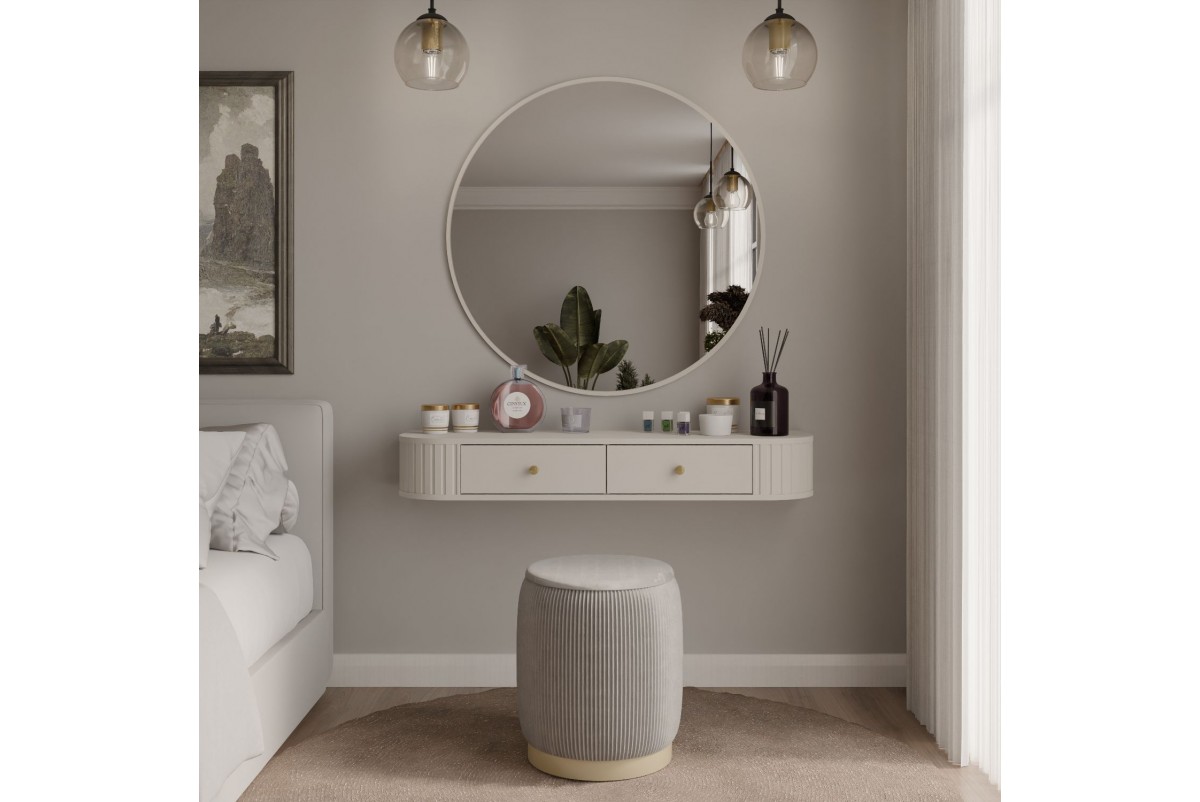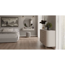Delikatne frezy oraz minimalistyczna forma mebli tworzą elegancką całość, w której każdy detal ma znaczenie. Akcenty złota – w postaci metalowych uchwytów i nóg – dodają nowoczesnego charakteru, jednocześnie zachowując przytulny klimat.
